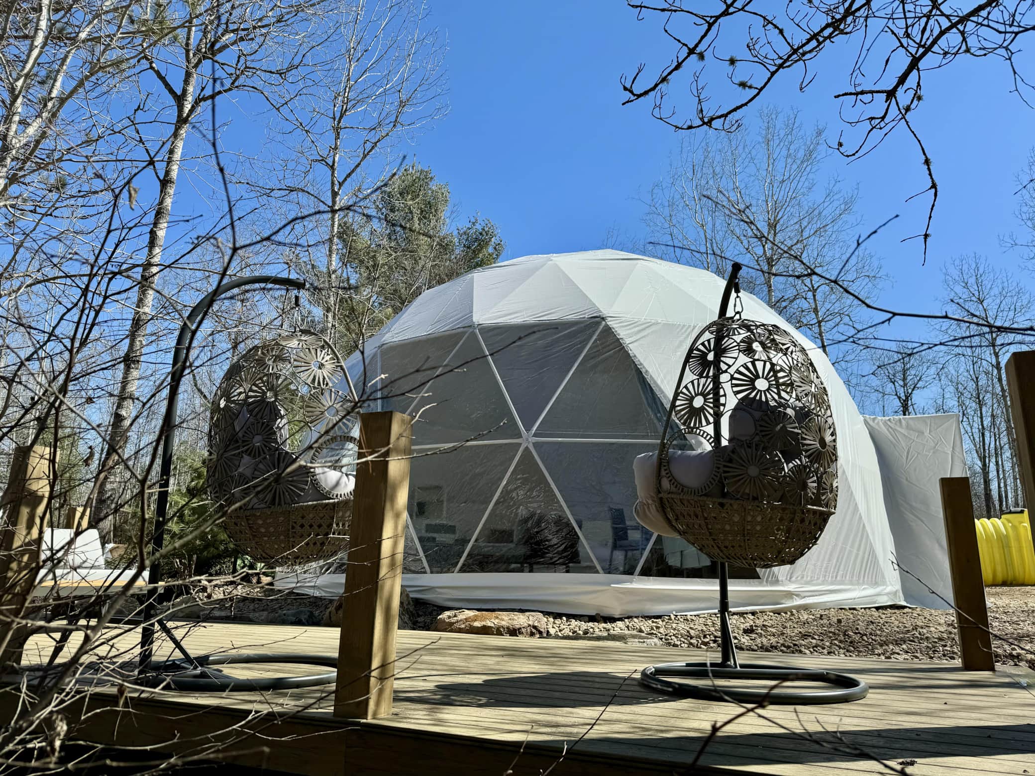 Welcome to our unique dome retreat nestled in the heart of Madawaska! Escape the hustle and bustle of everyday life and immerse yourself in a one-of-a-kind experience. Our geodesic dome offers a perfect blend of modern comfort and natural serenity, making it an ideal getaway for couples or small groups seeking a memorable stay. Enjoy a swim, or a canoe/kayak, or just soak up the sun on your private waterfront daybed.